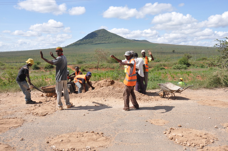 Further on they were patching the old road - well, filling the potholes with murram.