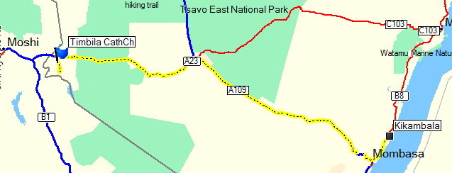 We were up soon after 4, away soon after 5, then fuelled we worked our way through and out of Mombasa on the Nairobi road, the early stages full of slow lorries, with the overnight buses from up-country heading in to Mombasa. We were at Voi for breakfast in 3 hours. Along the way, the road and railway often run in parallel, and we actually saw a "train for Julian"