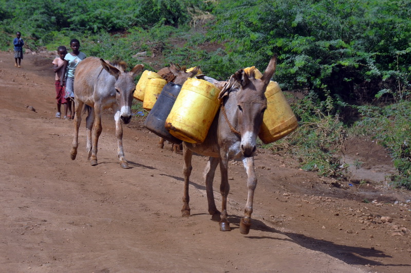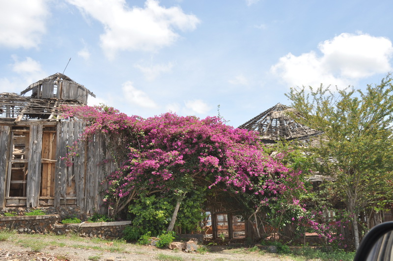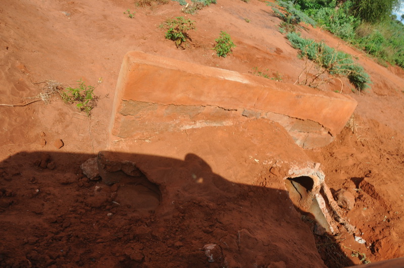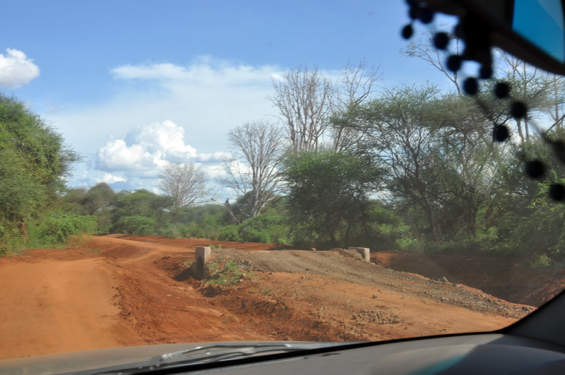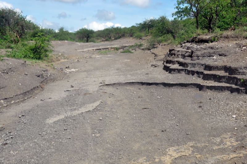 The road had dry fords and culverts at frequent intervals. The culverts are pipes across the road to carry rainwater, ramped with gravel on either side, if the gravel hasn't washed away> Some, like this one, have broken. This was the scary view from the passenger window - I couldn't see that we were on a solid section of pipe!