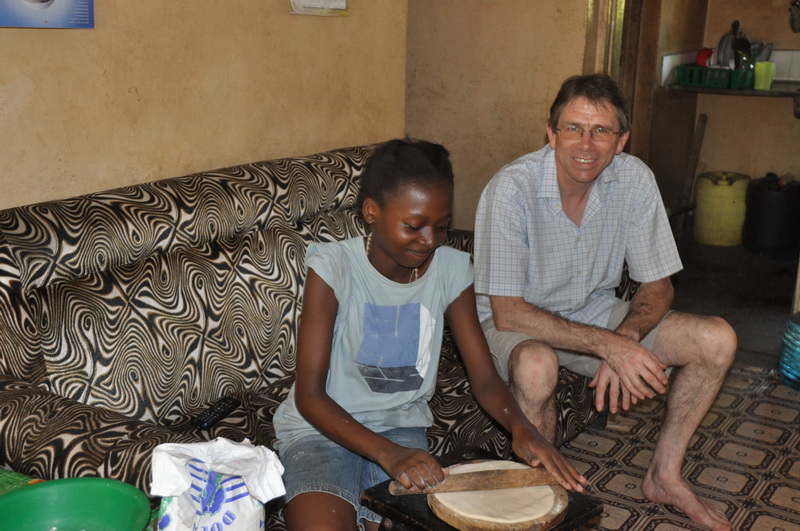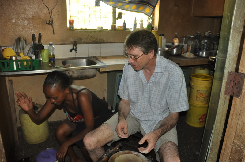 In the kitchem, I rolled each catherine wheel out to fit the frying pan, while Maggy cooked the chapatis over a charcoal fire. Every few chapatis, she put several chapatis in the pan together to finish cooking, then stored them in a hot pot.