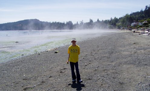 And so, the morning dawns: our last together. Packing - for two groups going in separate directions - "will I wear this in Vancouver?". Car loaded (and how!) Bridget, who'd been under the weather and not come to the beach yesterday, made a brief first and last visit; the sun was making the sand steam.