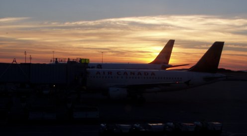 Jean and I then went to check in - massive queues ("computer failure") - over 1.5 hours. So straight through to pay the $15 required to be allowed out of YVR airport, and through to the gate. A brief wait, then boarding. We have a window seat, and the view of the setting sun over the neighbouring aircraft.