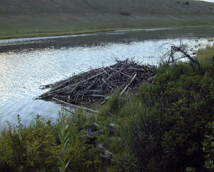 We took an evening stroll down by the lake, to see the beaver lodge - a massive pile of wood.