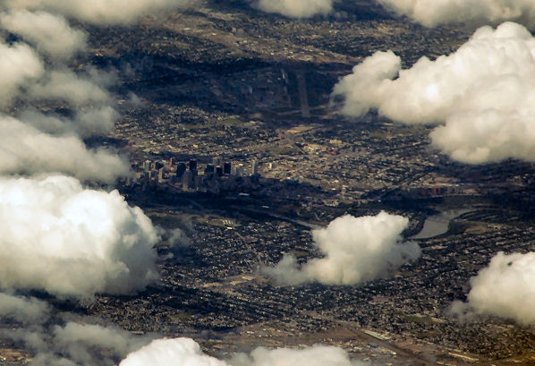 Over the centre of Greenland, then down over Baffin Island and the north of Canada it was mainly covered with cloud, though we got occasional glimpses through, including icebergs in a beautiful blue sea. We then headed south over Alberta and the cloud started to break, including this glimpse of Edmonton (at least, I'm pretty sure it is Edmonton).