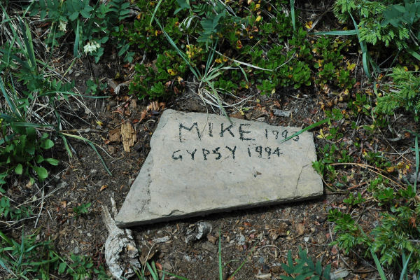 Just below our turning back point, Peter inscribed a stone for Dad and Gypsy.