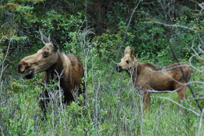 From Athabasca Falls we decided to take the back road to Jasper - it promised to be quieter, and the "rough road" sign suggested it might justify the Jeep. So we pottered along - oh, alright, we went a bit quicker than that, passing the road up to Mount Edith Cavell, until all of a sudden Meld shouted STOP. She spotted a moose and her baby beside the road. We reversed up carefully, and took a few pictures, and soon there was quite a huddle of cars stopped to look. The moose didn't seem worried.