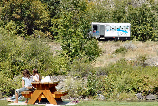 Lunch, just south of Lillooet, was interspersed by several vehicles (pickup, crane and this people carrier) diving up the railway on the other side of the river obviously some works were ongoing.