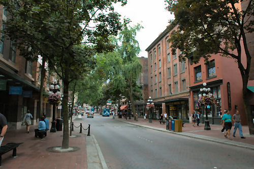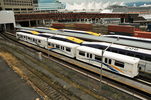 At the top of Water Street you get a view of the Sky Train, the double-decker West Coast Express and a cruise ship, as well as Canada Place with its familiar roofline.
