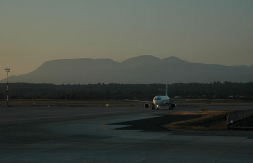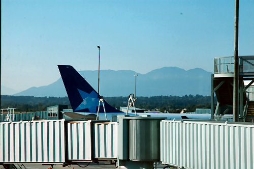 So to the gate - this is the Air Transat flight for Manchester sitting in front of the mountains