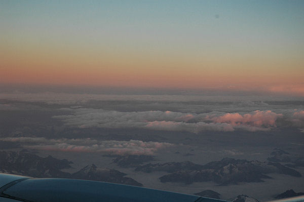 Then the sun set to our left, turning the clouds pink beneath us, before the light quickly failed (the effect of travelling rapidly east).
