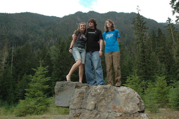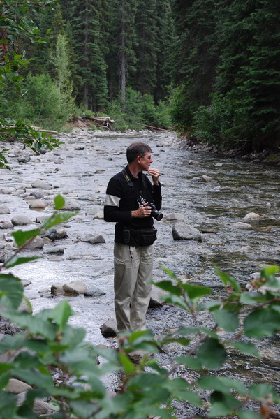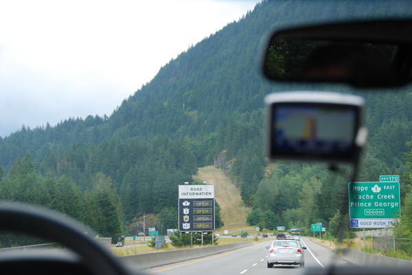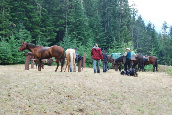 It was pretty grey, rainy in parts, as we left Highway 1 (Trans Canada) for Highway 3 (Crowsnest) and climbed into Manning Provincial Park. We stopped briefly at Cascades to find a large group of horse riders returning from a 9-day trail ride.