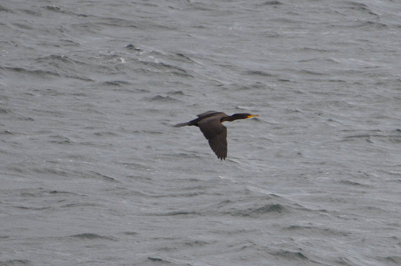 A cormorant flies past.