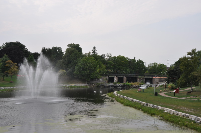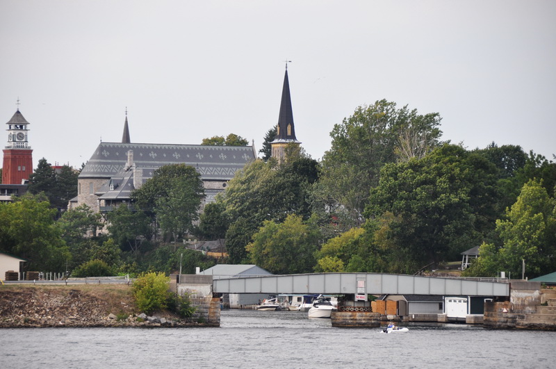 Gananoque - swing bridge, Catholic church (with decorative roof) and clock tower.