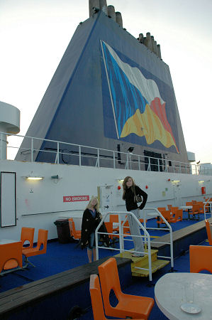 On the ferry we were able to quickly find a corner to sit (or lie down, in the case of the senior members of the party). As we approached Calais it was getting light and we took a walk outside. (We hardly had a clue we were approaching, until we were told by the ferry people, because the visibility was so poor!) Although it was quite a calm crossing we did have a couple of moments where we were flung across the ship and I landed in the vending machine. Rosie was a bit silly and didn't realise that there was a bridge thingy over the brown thingy which meant she got her trousers a bit wet & I stupidly followed but stepped over rather than trying to climb over.