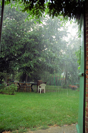 M-H then led us out of the village down towards the family farm where we are to stay. We staggered our bags in, just before the rain started, and we we watched it pour down from the open doorway (OK, some of us went out and danced around in it!) (It was the fun kind of rain! Massive cold drops that soak you in minutes! Can I photoshop a picture of me spinning on top so it looks like you took a picture of me in the rain?!) It had been nice all day and then we arrived to this...
