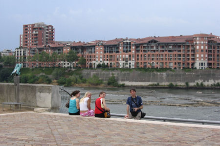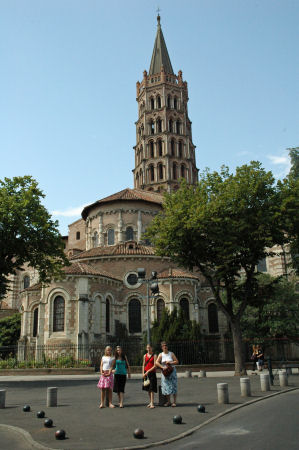 So we headed back up the N20, then Deirdre led us of on an interesting excursion, crossing the Ariege and approaching Toulouse on a small road following the rive gauche of the Garonne. We had decided to park by the Basilica St Sernin, the "must see" church in Toulouse (especially for pilgrims) and our route took us up some of the main shopping streets - at a speed that allowed the females of the party to window shop! Not the ideal way to get from A to B, but useful on occassion - especially in the Galaxy with its big high windows. We also passed some of the interesting old buildings.