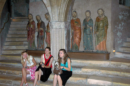 Down in the crypt, the girls sat with the 15th-century polychrome wood apostles.