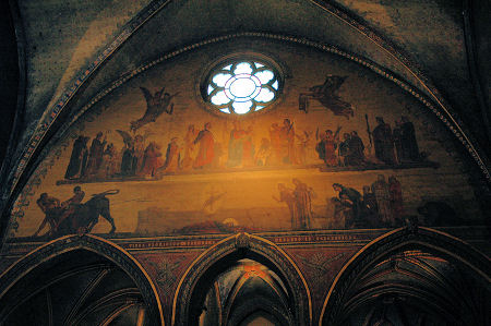 We then walked down Rue du Taur, down which St Saturnin (St Sernin) was dragged by a bull. Half way down the road is the church of Notre Dame du Taur, with this wall painting that illustrates the event.