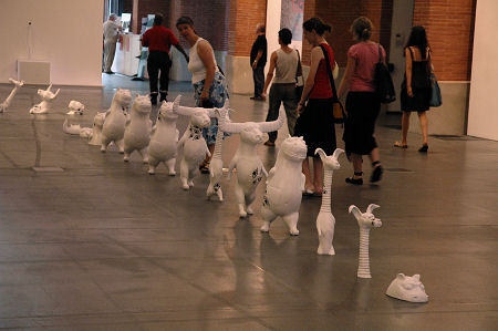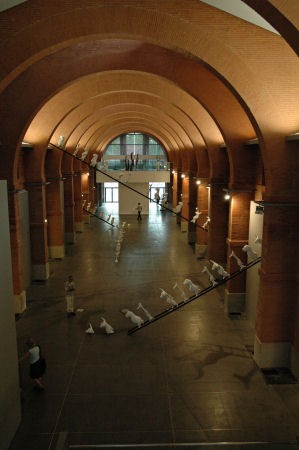 We then crossed the river (by car - over a bridge) to Les Abbatoirs. The old abattoir has been converted into a modern art gallery, and offered an opportunity for Rosie to do some homework. We were greeted by lines of animals (with eyes in strange places) coming up and going down.