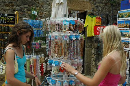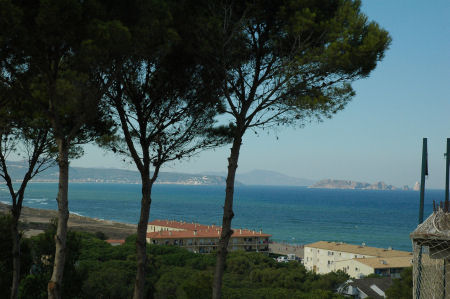 After shopping and then lunch back at the campsite I went for a walk down to the southern end of Platja de Pals, where the Costa Brava cliffs start. From among the smart houses I was able to sneak a view across the bay, giving some idea how long the beach is - and the scaffolding in the right corner is evidence of more building work on the hillside.