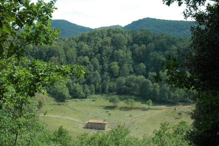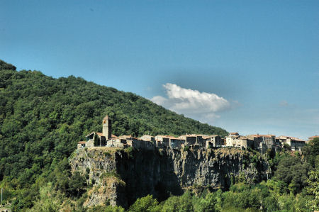 Today we headed inland to the area of extinct volcanoes known as La Garrotxa. The route took us round the north of Gerona and past Besalu (which we visited some years ago, and we simply drove past slowly so that Kim could see the mediaeval bridge etc).