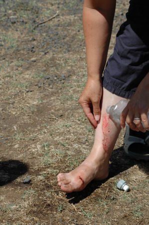 Unfortunately the volcanic rubble was rather loose and Meld managed to slip and land on top of her leg, which grazed on the stones. We did our best to clean her up and get her down to the car again where we could do a proper first aid job.