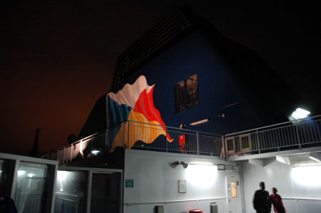 On board the captain warned of "severe gale force 9" winds in the channel, but it was only a bit choppy. Approaching Dover from the east (in the lee of the cliffs) we went out on deck for fresh air...