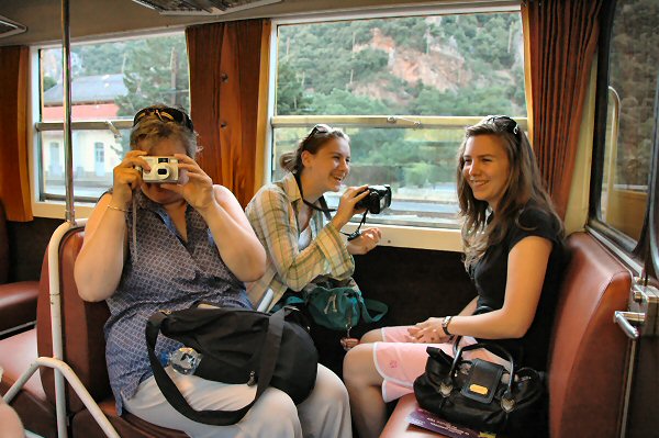 At one station we had to wait ages for the down train to come, whch made us half an hour late.Eventually the train came down the hill.