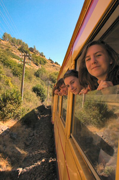 On to today: we would take the Petit Train Jaune (Little Yellow Train) which runs from Villefranche-de-Conflent all the way to La Tour Carol, high in the mountains by the Spanish border. But we would only go half way, on a one-way ticket, and Meld and Mark would drive up and meet us at Mont Louis station. A photo opportunity, outside...