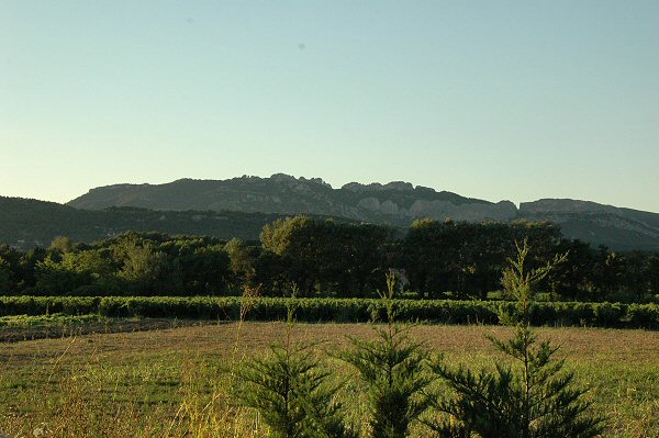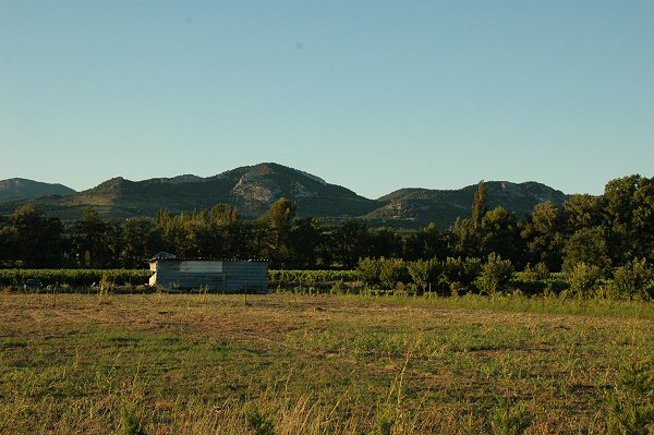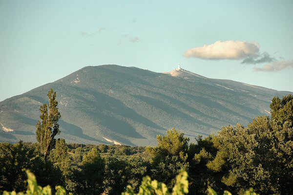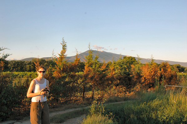 Anyway, no sooner had settled ourselves at the table but the heavens opened. We retreated to the car - just as well as it absolutely lashed down for about half an hour. When we restarted the roads were running with water and visibility was severly limited by spray. Eventually we skirted round the eastern side of Lyon, just missing the queue when an articulated lorry jacknifed. Somewhere south of Lyon the temperature, which had been about 20 but down to 15, jumped to 30! Onto the main A7 the traffic was heavy but flowing, and we cruised past Valence, Montelimar and Orange before turning off towards Carpentras. This town proved bigger than we remembered and it took a whle to find the campsite. When we did it was full! They recommended a couple of other and, after some phone calls to check availabiliy, we ended up at Aubignan, a few kilometers north towards Mont Ventoux. Meld and I went off in search of money and foods (success), then B and I went off to get some pictures for the diary. This is Mont Ventoux.