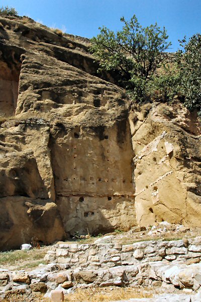A little road climbed up the hillside, and looking back gave views of this castle (above the trog houses, seen from the other side)