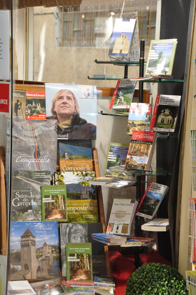 A whole window display of books about the Chemin de Saint Jacques de Compostelle.