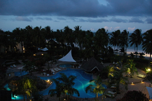 Our overnight stop is Eden Roc, which transpires to have changed little in years. It's much less developed than the resorts we've stayed at, which makes it quite attractive, but it deserately needs some maintenance. This is a view from the garden that runs to the beach back to the row of suites that some of us are in.