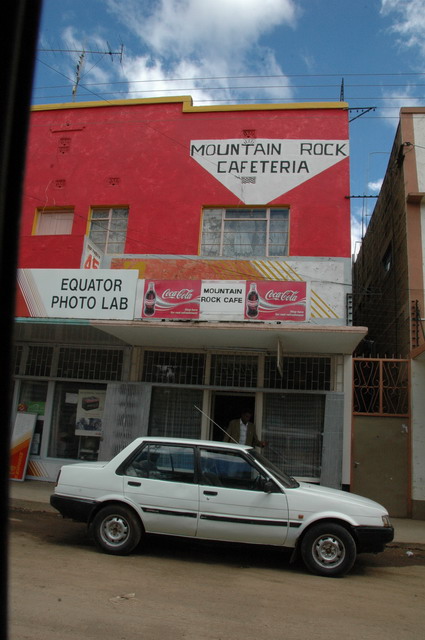 Today we had a site visit at Isiolo, north-east of nairobi, beyond Mount Kenya. It was an early start, cool and grey. We were in safari buses again, but this time (although the road wasn't bad) it seemed long and uncomfortable. After about 3 hours we stopped at Nanyuki for beakfast at the Mountain Rock Cafe. Nanyuki is just about on the equator, and over 1,000 feet higher than Nairobi.