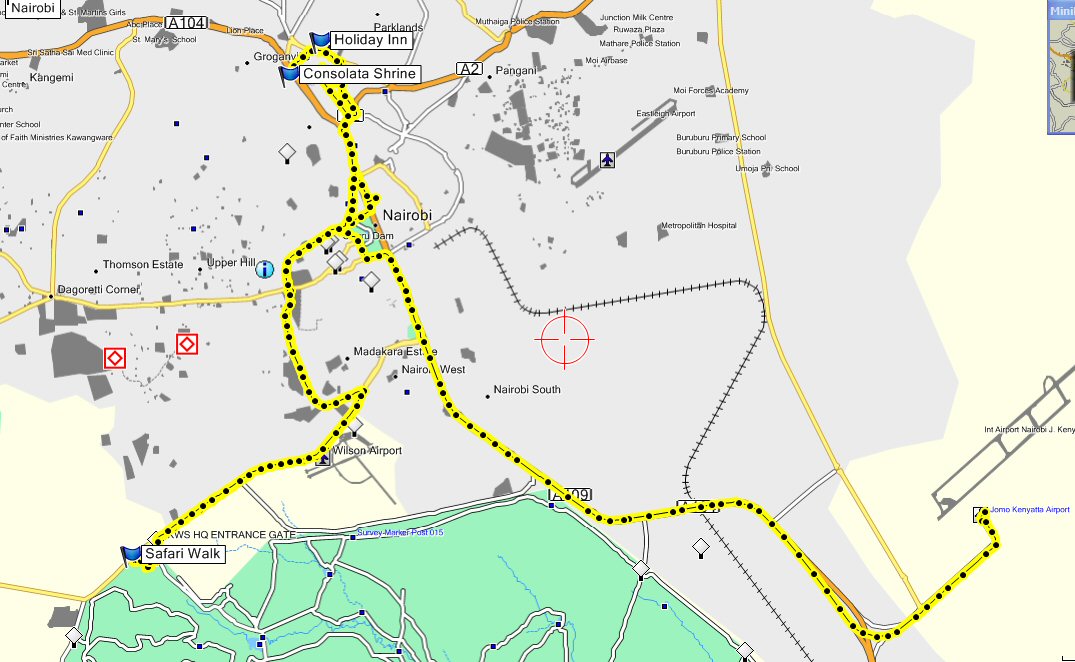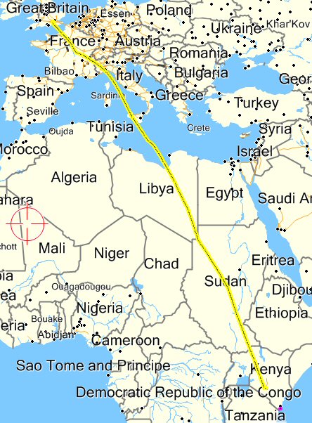 Then, via Granny's and Nanna's, we drove to Heathrow. All straightforward. Parked, tranferred to the terminal, queued in line. There seemed to be some kerfuffle over too few seats, but as we'd checked in online we had seats allocated. Security and shopping completed, we found ourselves boarding before we knew it. The flight was OK - economy on KQ has a smaller seat pitch than AC and it was difficult to move in your seat (I've been spoilt with their Premier World business class, but it proves that you couldn't fly over night and work the next day if you flew economy). Meld was disturbed by the fidget the other side of her, so neither of us got the best night's sleep. Still, the GPS tracked whether we were awake or not and arrived slightly ahead of time in Nairobi, following the "usual" route (rather than the more easterly one over Egypt).