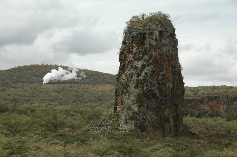 The Central Tower (another plug) with steam escaping from the ground behind. There is lots of accessible geothermal energy here, but they have to release the pressure first, and there is a continuous whooshing sound (like a steam loco letting of steam).