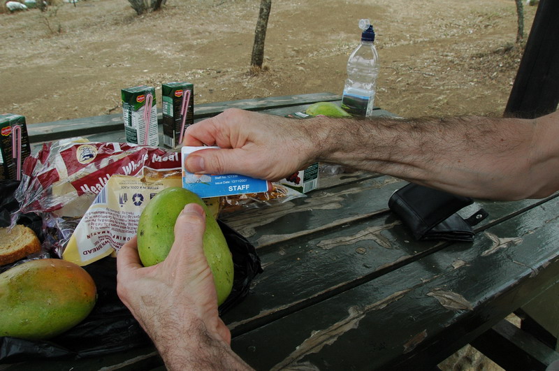 Back at the car park we had a picnic lunch. No knife to cut the mango, but an Atkins staff card works!