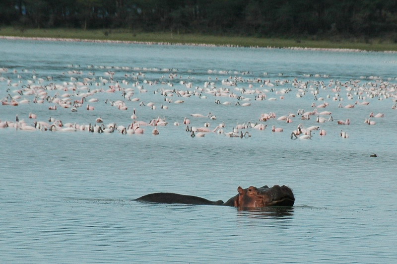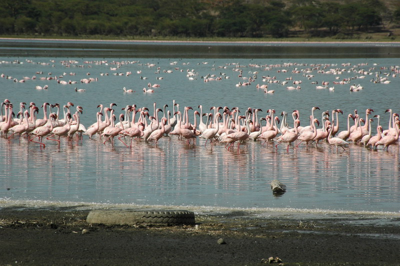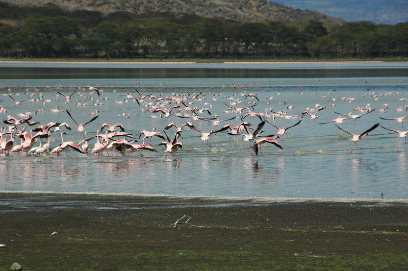We left the park and drove to Lake Naivasha. This is the south lake which is saltier, which attracts the flamingoes. From afar the lake looks like it has a pink fringe. You can see the pink shoreline beyond the lake here. Lots of flamingoes, in almost perpetual motion, though the group appears still until they take flight.
