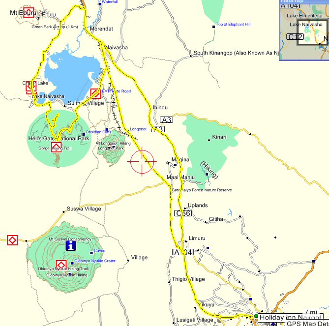 We headed along the "new" road which stays above the rift valley for longer. Ironically this road is not suitable for the big trucks (weight limit on a bridge) so it's an easier drive, apart from a succession of police checks. We stopped at a view point (about 8,000 feet asl) to look out over the rift valley. Centre left on the horizon is Mount Longonot, the volcano I climbed in May 2008.