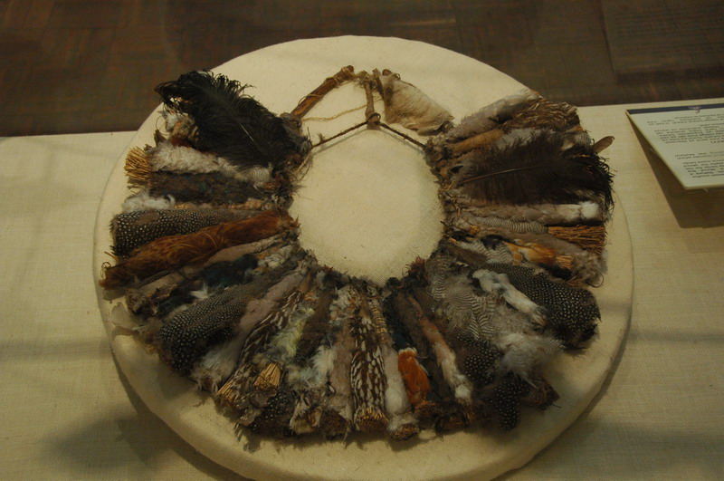 A decorative neck ring made of many different bird feathers.