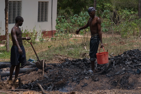 At the sisters' place the workmen have dimantled the charcoal pile and are cooling it all off.