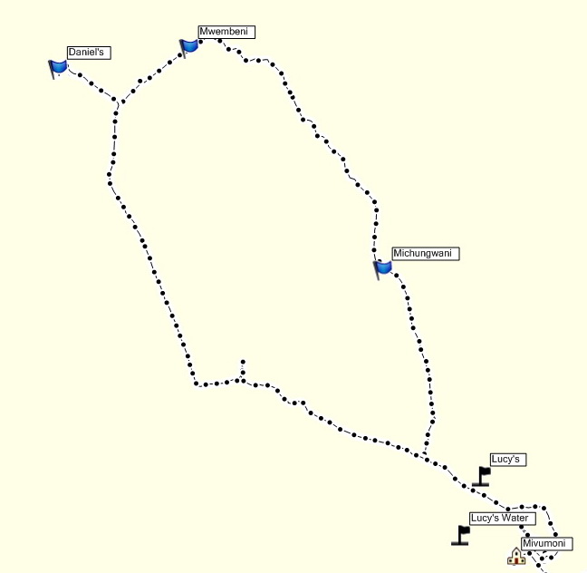Our route passed the two boreholes we helped get restored in 2009. One (at Michugwani) had recenty stopped working and is awaiting an engineer on Monday, the other is working well.