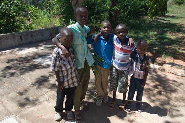 Everyone gathers around the pile of palms, which Fr Joe blesses.