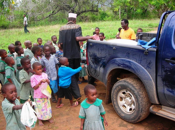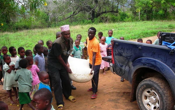 Bags of flour, beans etc arrive at Dima in the back of Joe's truck.