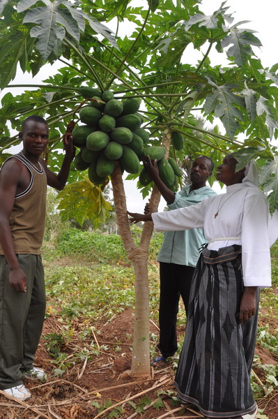 One of the sisters and two of the men who work the shamba show off a prize crop of papaya.